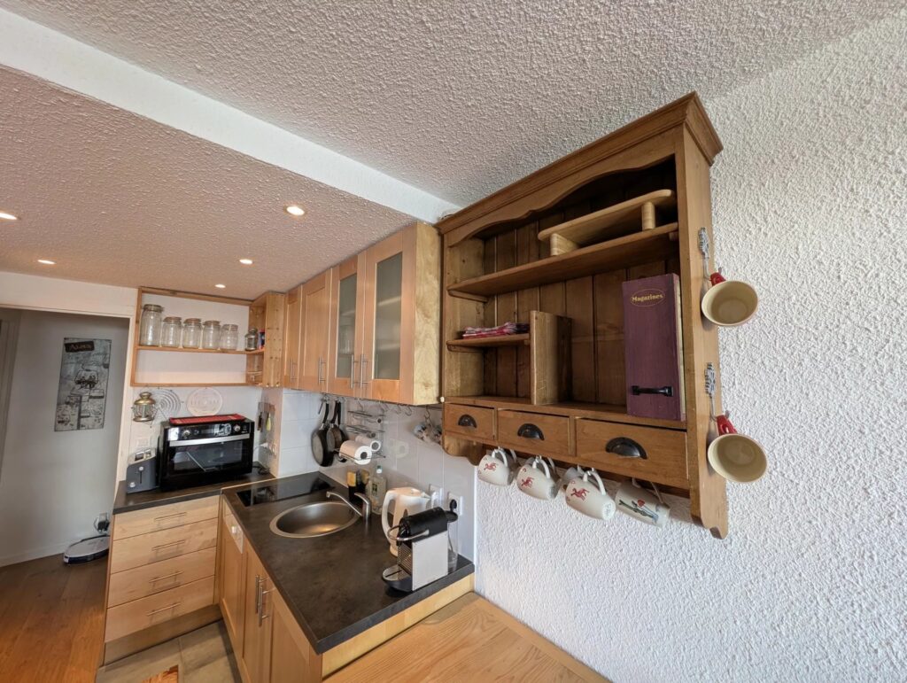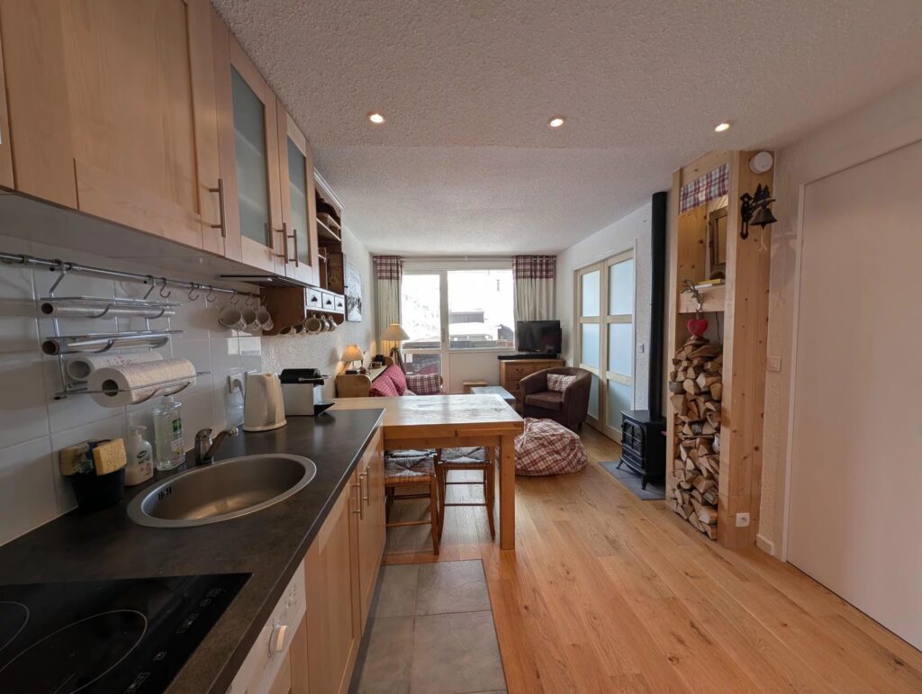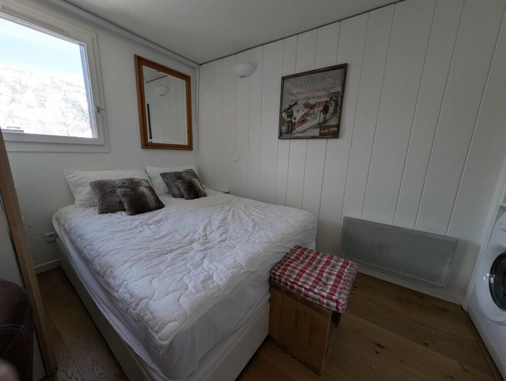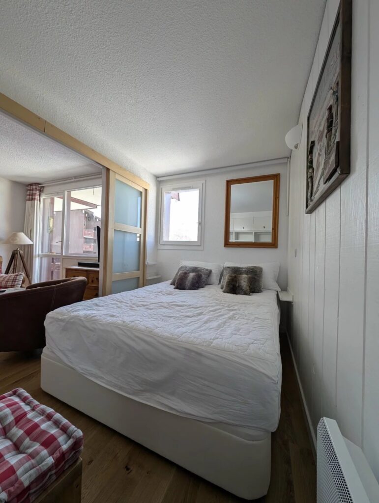 PC201 Appartement 2/3 pièces de 37 m², situé dans un immeuble chalet au coeur du « Hameau » (versant sud station) à 15mn à pied du centre. Avec une belle vue sur le centre du Hameau et les montagnes,Il dispose d’un salon pouvant être coupé en deux par porte coulissante pour la nuit avec chambre lit double, dressing et lave linge. Dans le couloir d’entrée, un coin nuit fermant par une porte avec 2 lits superposés (ne conviennent pas aux adultes). Fenêtre. Salle de bain et WC séparés. Parquet au sol. Belle prestation. Casier à ski. Balcon. NON FUMEUR. PAS DE FÊTES.