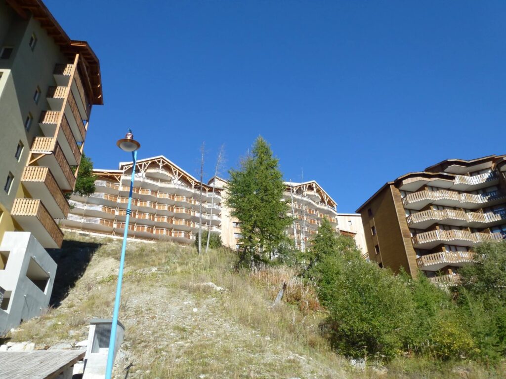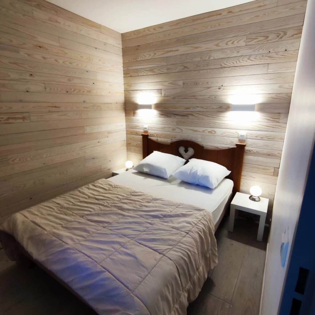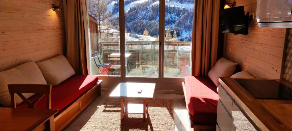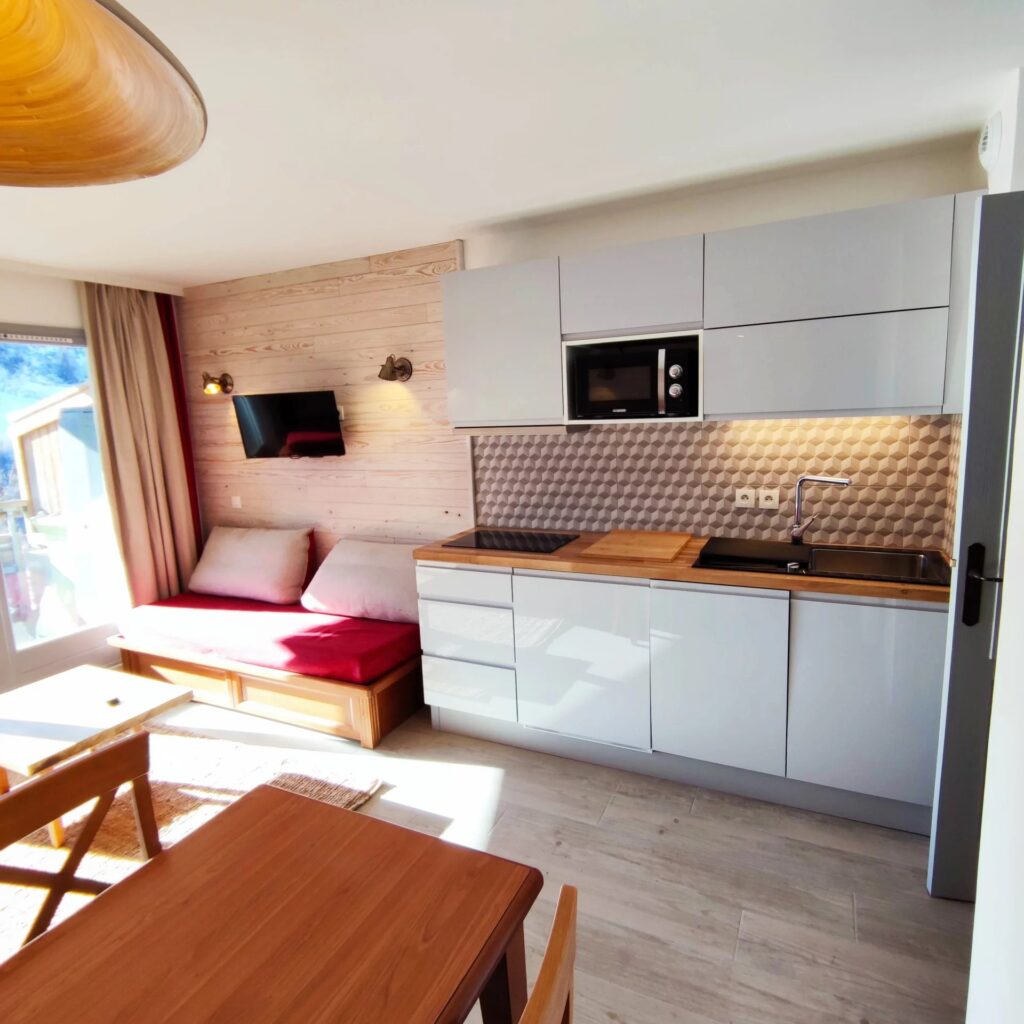 Il renferme une chambre avec 1 lit de 140 ; un séjour avec 1 canapé lit gigogne et 1 banquette lit, une cuisine américaine et un coin repas, wc indépendant et salle de bain. Balcon avec vue sur le versant nord et les pistes.