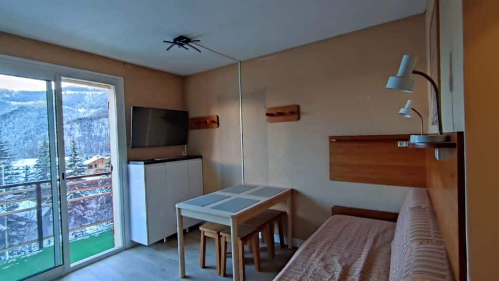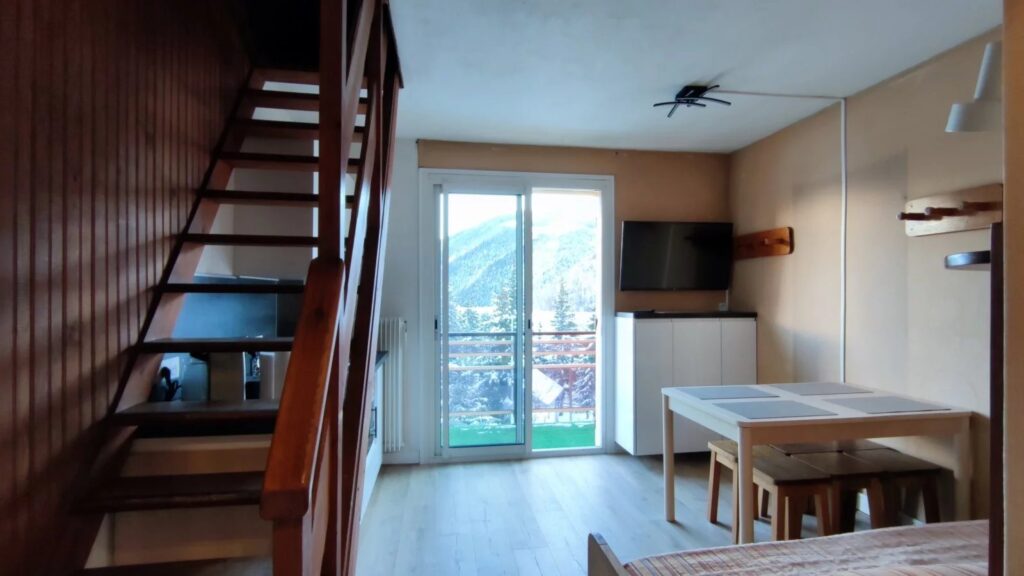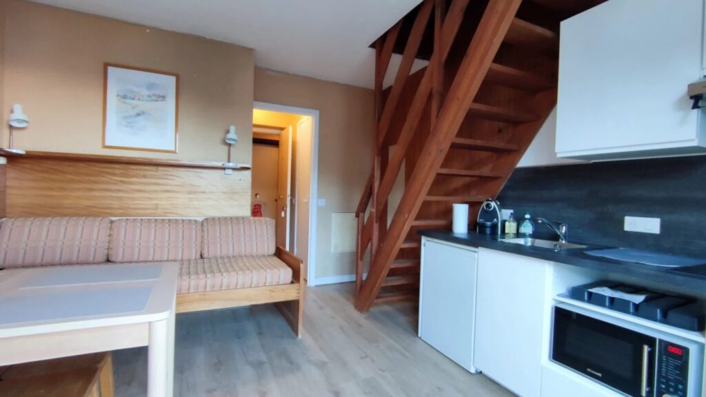 Situé plein centre station. Deux pièces en duplex, au 3ème étage d’un immeuble sans ascenseur. séjour avec kitchenette, balcon sud vue piste, proche commerces et remontées mécanique. salle d’eau, W.C indépendant. A l’étage une grande chambre avec un lit double et deux lits simples séparés par une armoire. Casier à skis, parking extérieur.