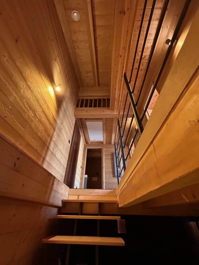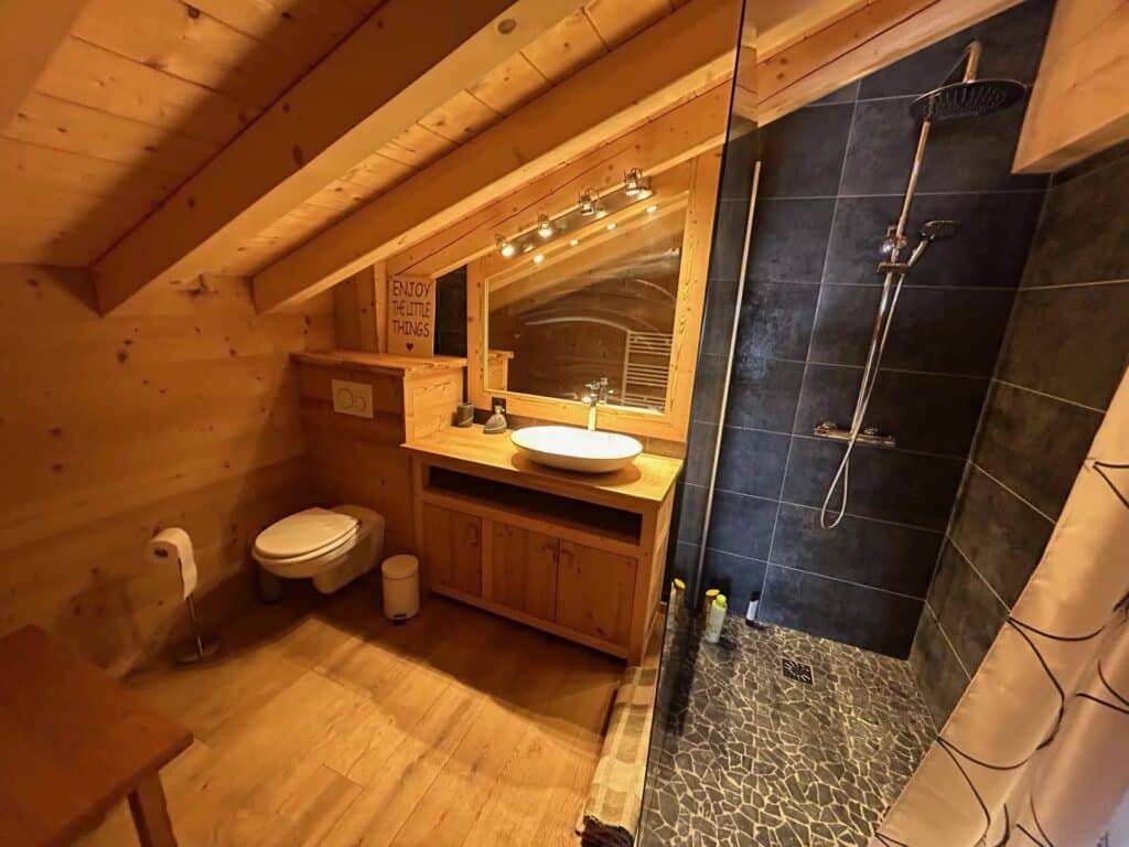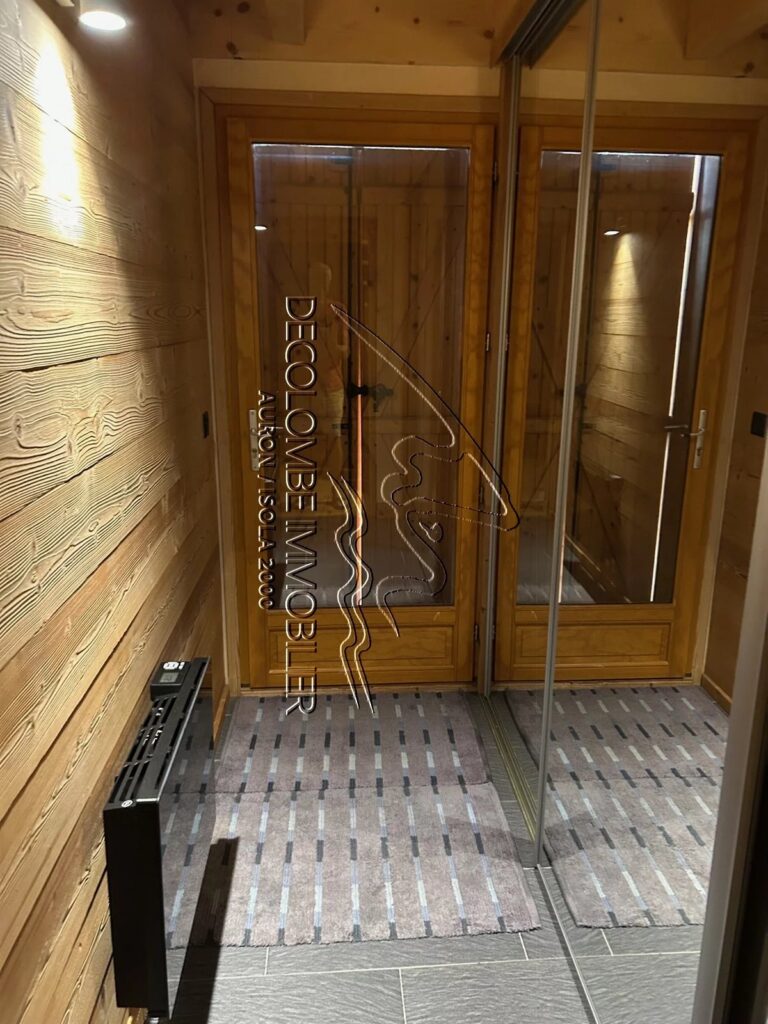 En rez de chaussée, une deuxième entrée placards et ski room, un grand séjour avec cheminée, cuisine américaine, salle à manger, donnant sur la terrasse. Un double garage avec recharge pour voiture électrique dans le collectif Chalets du Mercantour.