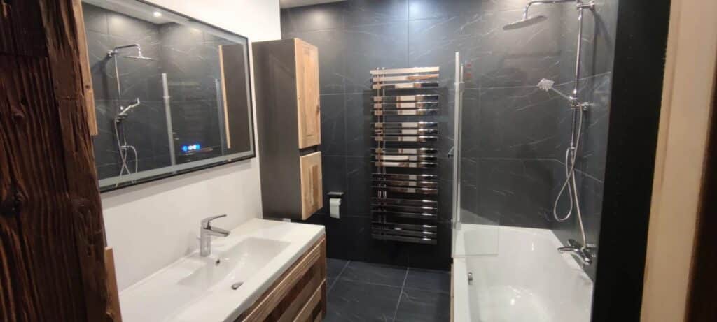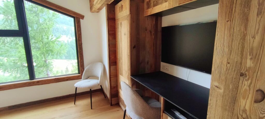 Pour le chalet : rez-de-chaussée avec séjour, cuisine américaine, coin repas, vestibule dans l’entrée, local à ski, WC indépendant, étage : 1 salle d’eau, WC, chambre lits 160, 1 chambre enfant avec 1 lit double et 4 lits simples, niveau -1, 2 chambres lit 160 avec salle de bain, WC et salle d’eau, WC, sauna hammam.