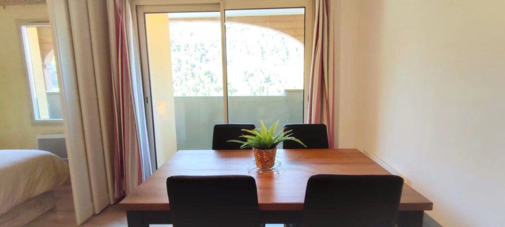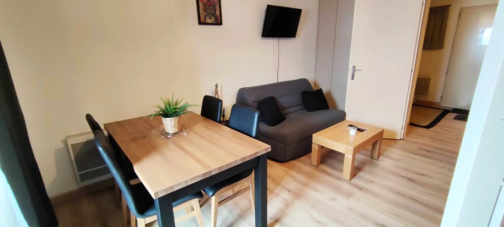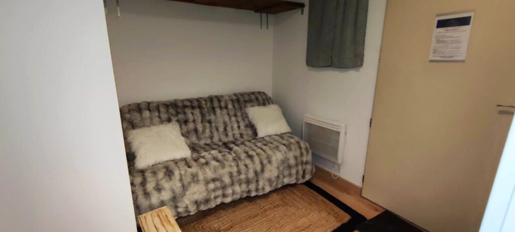 Il renferme une chambre avec 1 lit de 140,un séjour avec 2 couchages (1 canapé lit BZ 140). Cuisine américaine et un coin repas, wc indépendant, une salle de bain