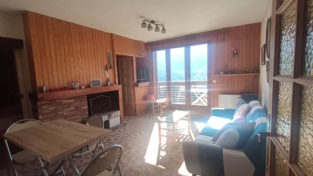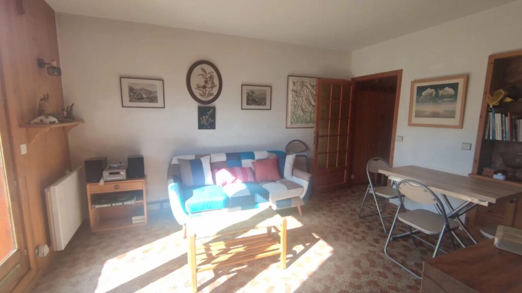 Trois pièces équipé pour 6/7 personnes. cuisine aménagée. séjour avec terrasse, coin nuit avec 1 couchage, deux chambres avec chacune un lit double et mezzanine. Une salle de bain, w-c. indépendant. proche du parcours de santé et desservi par des navettes gratuites. Casier à skis.